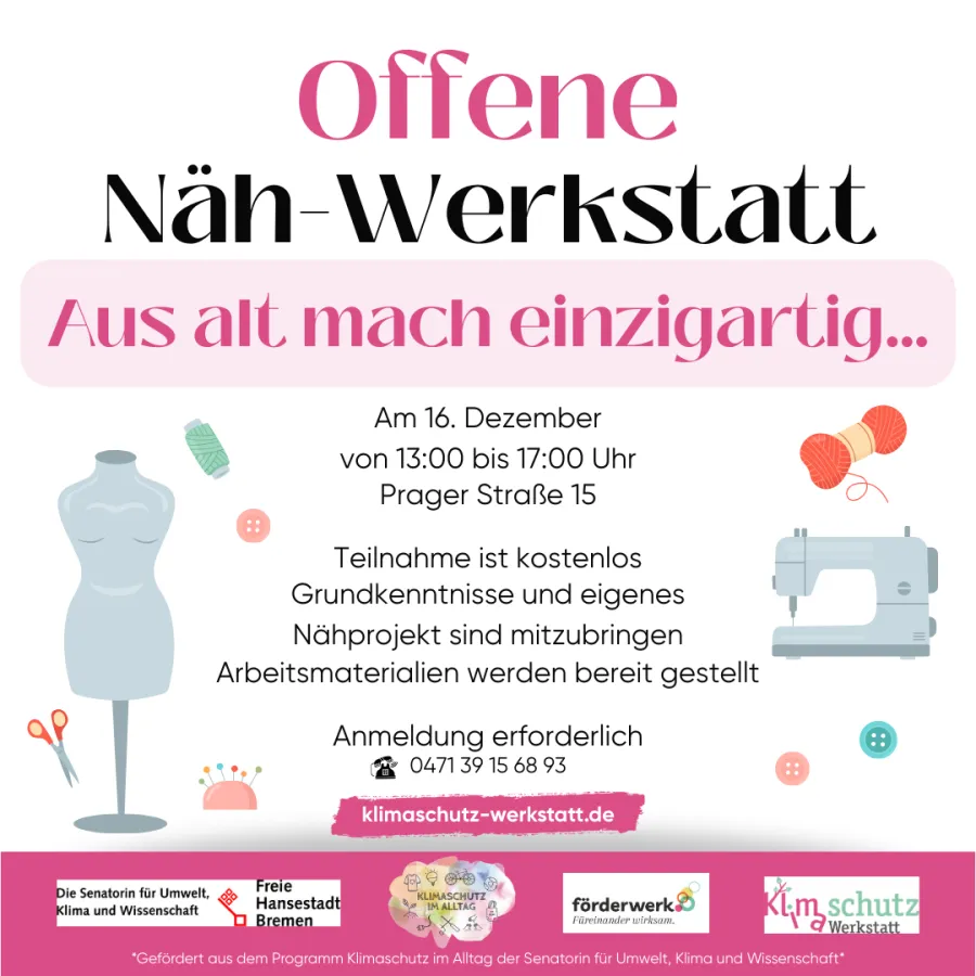 Am Dienstag, den 16. Dezember 2025, lädt die Klimaschutz-Werkstatt in der Prager Straße 15 von 13 bis 17 Uhr zur „Offenen Näh-Werkstatt“ ein. Unter dem Motto „Aus alt mach einzigartig“ dreht sich alles um nachhaltiges Nähen, Upcycling und den Spaß am Selbermachen.