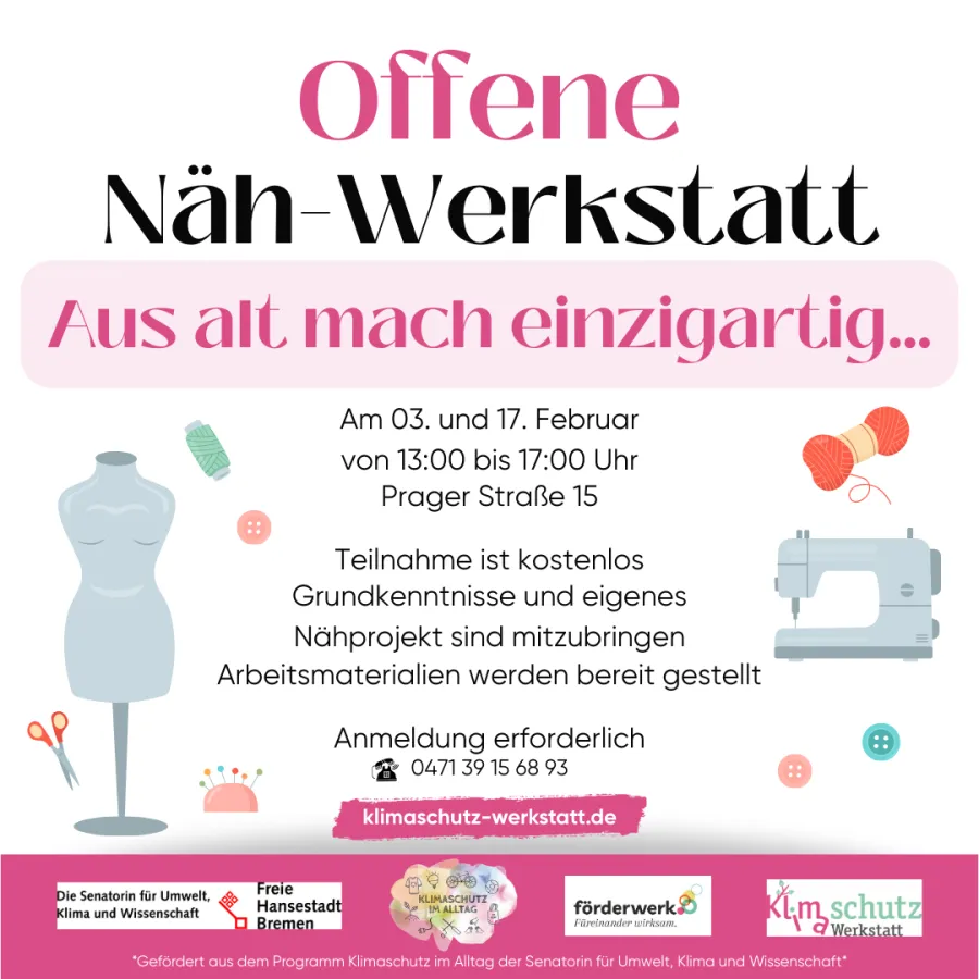 Die Klimaschutz-Werkstatt lädt alle Nähbegeisterten und Umweltfreund:innen herzlich zur offene Näh-Werkstatt in die Prager Straße 15 ein: Von 13 bis 17 Uhr können kreative Köpfe in gemeinschaftlicher Atmosphäre an ihren Projekten arbeiten. Die Teilnahme ist kostenfrei. Um Anmeldung wird gebeten